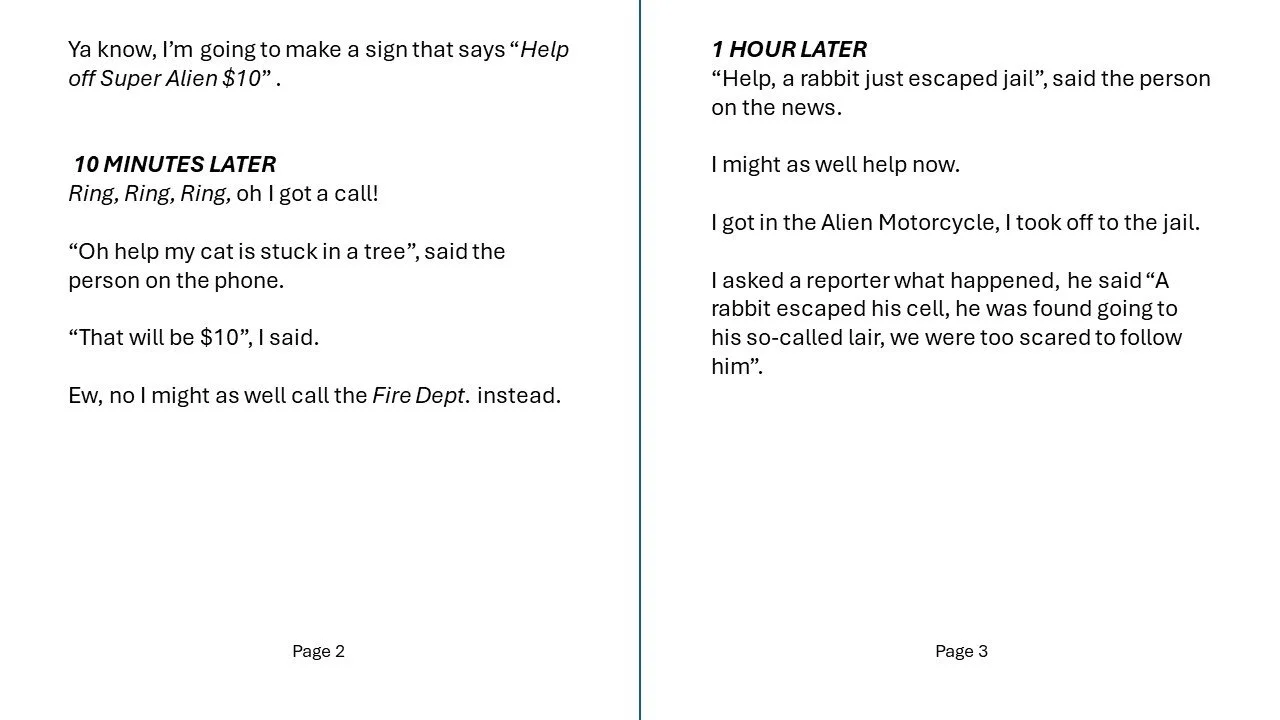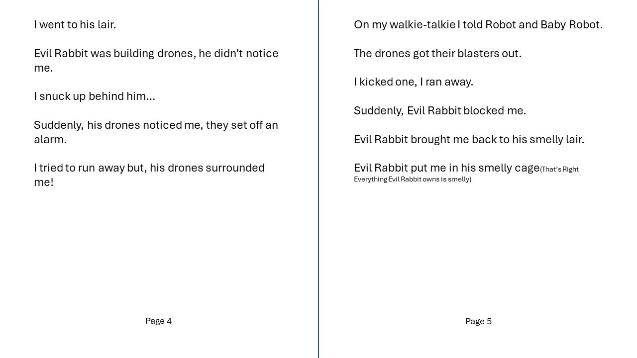 A two-page digital story or poem with text about a character's encounter with Evil Rabbit and robots. The story is presented in a simple, black serif font on a white background, with page numbers at the bottom.
