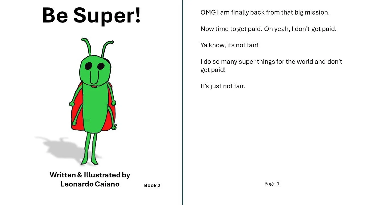 Cover page of a children's book titled "Be Super!" with an illustration of a green insect wearing a red cape. The book is written and illustrated by Leonardo Caiano, and this is page 1.