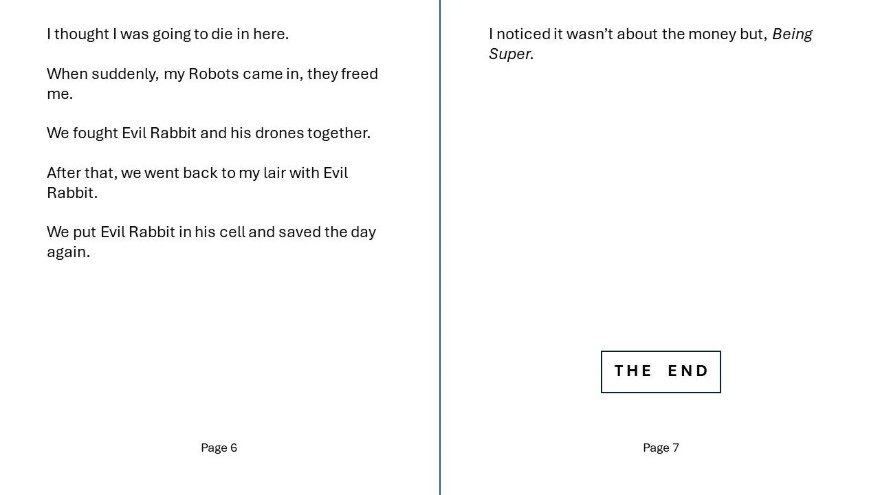 Pages 6 and 7 of a story. Page 6 contains text about robots freeing someone from Evil Rabbit, fighting Evil Rabbit and his drones, and saving the day. Page 7 contains text about noticing it wasn’t about money but being super, followed by "THE END" in a box. Both pages have footer text: "Page 6" and "Page 7."