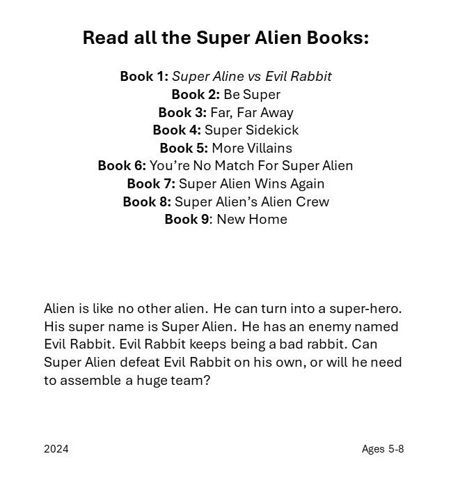 List of titles of nine super alien books, starting with 'Super Alien vs Evil Rabbit' and ending with 'New Home,' along with a paragraph describing Super Alien as a hero fighting against his enemy Evil Rabbit, aimed at children ages 5 to 8.